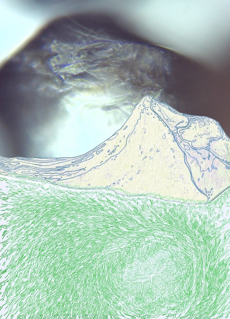In my own practice, I find microscopic imagery to be a powerful tool when attempting to envision something that is not normally visible. Here, I have reconstructed a microscopic image of a cross section of an umbilical cord into the ground beneath Mauna Kea, which is currently being protected by Hawaiian activists from further development and desecration. McDougall laments how sand is imported from faraway places to create false beaches for tourists on Hawai’i. I have also microscopically explored the intricacies of single grains of sand.